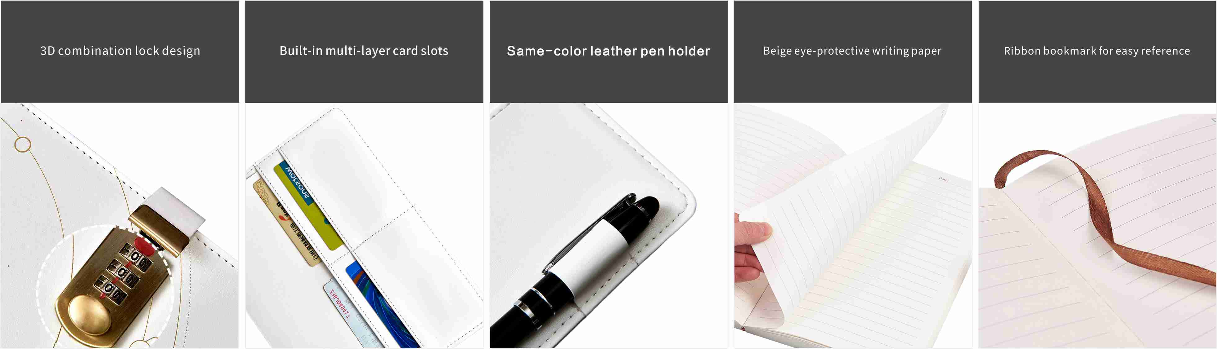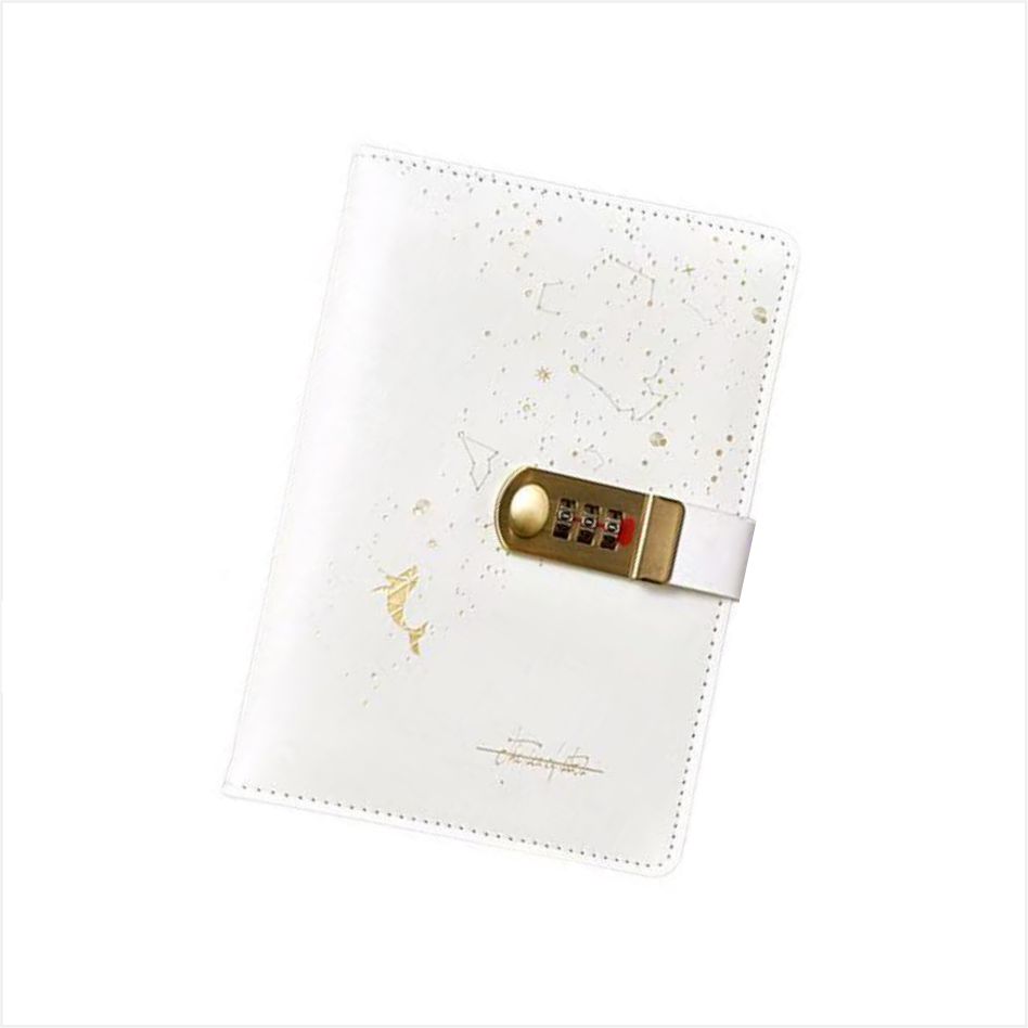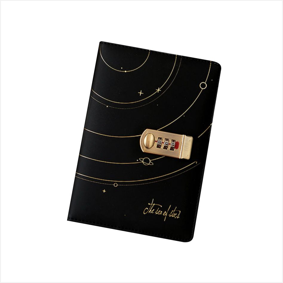 De omslag van dit dagboek met sleutel is gemaakt van voortreffelijke vergulde technologie, die een traject schetst dat lijkt op een planetaire baan met eenvoudige lijnen, bezaaid met kleine puntjes als sterren, alsof de mysterieuze nachtelijke hemel in beeld wordt gecondenseerd, rustig en vol verbeeldingskracht. Het is uitgerust met een gouden metalen cijferslot, dat wordt bediend met een driecijferig wachtwoord. U kunt uw eigen wachtwoord instellen om ervoor te zorgen dat alleen u de inhoud kunt openen.