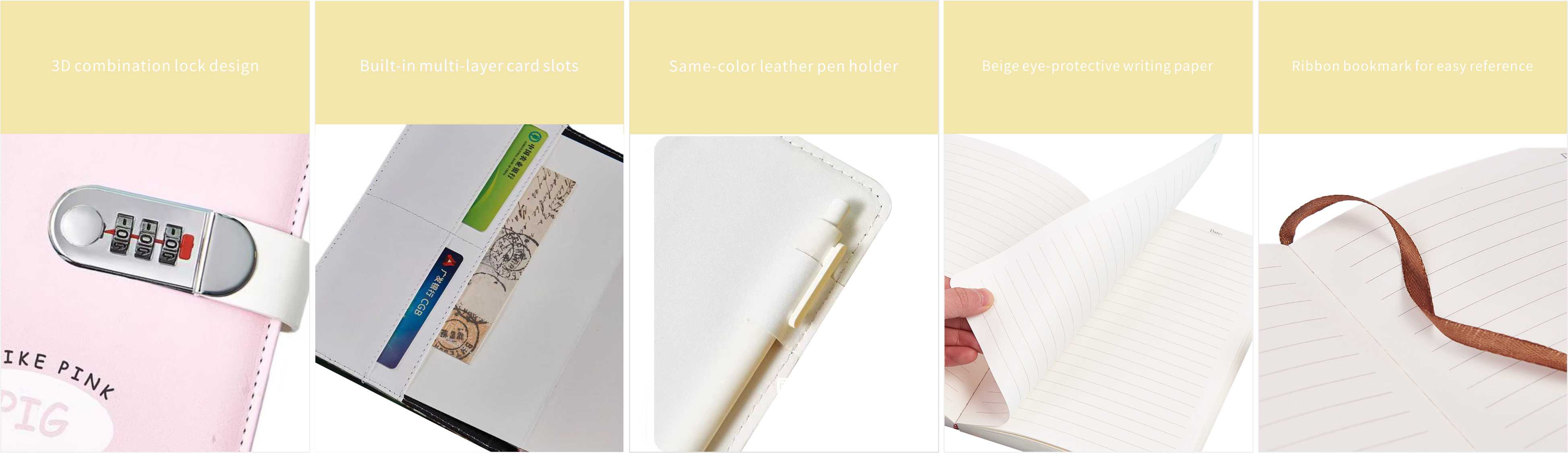 Dit dagboek met wachtwoordvergrendeling biedt een verscheidenheid aan schattige omslagpatronen. Welke stijl je ook wilt, je kunt hier je favoriete keuze vinden. Het is ook uitgerust met een stevige en duurzame metalen wachtwoordvergrendeling. U kunt zelf een uniek wachtwoord instellen om ervoor te zorgen dat alleen u het kunt openen en de innerlijke pagina kunt lezen, waardoor betrouwbare bescherming wordt geboden voor uw privacy en belangrijke informatie. Om het u op elk gewenst moment handig te maken om uw ideeën op te nemen, stelt ons dagboek ook zorgvuldig een penpositie in. Het kan de pen gestaag vasthouden, zodat u op elk gewenst moment een penrecord kunt nemen wanneer u het nodig hebt. Een andere prominente functie is de innerlijke tasfunctie. Dit dagboek met wachtwoordvergrendeling is uitgerust met meerdere kaartbakken en binnenzakken, waarmee u bankkaarten, ID -kaarten, lidmaatschapskaarten, bonnen en andere items netjes kunt opslaan, en u hoeft zich geen zorgen meer te maken over het verliezen van deze belangrijke items.
