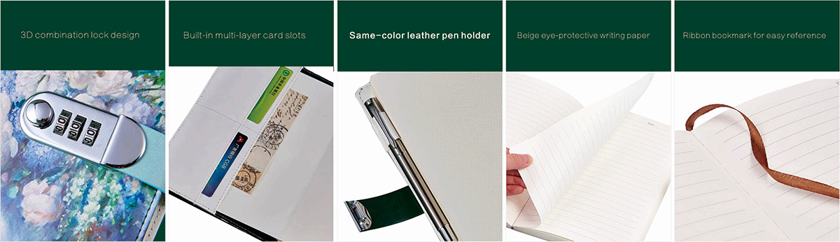 Het omslagontwerp van dit vergrendeldagboek is een prominente functie en heeft een unieke artistieke charme. We bieden een verscheidenheid aan patronen, die een verscheidenheid aan artistieke stijlen behandelen. Deze ontwerpen zijn niet alleen mooi, maar hebben ook uitstekende slijtvastheid en waterdichte eigenschappen, die uw dagboek beter kunnen beschermen en u lang kunnen vergezellen.